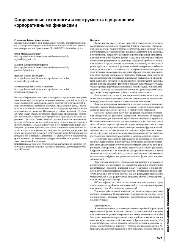 Современные технологии и инструменты в управлении корпоративными финансами / Л.А. Сетченкова, М.Д. Вейль, Д.В. Кужилин [и др.] // Экономика строительства. – 2025. – № 4. — С. 471-474. — Только в электронном виде. — <URL:http://elib.fa.ru/art2025/bv1575.pdf>.