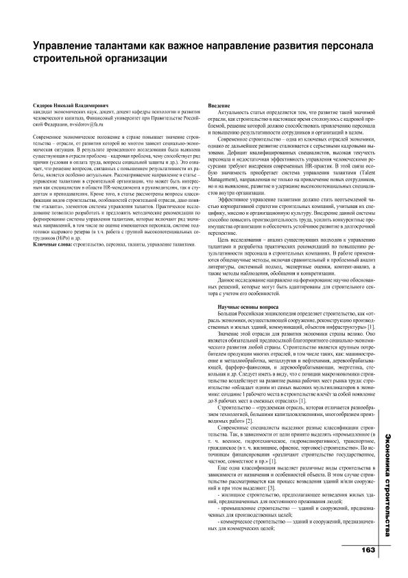 Сидоров, Н.В. Управление талантами как важное направление развития персонала строительной организации // Экономика строительства. – 2025. – № 4. — С. 163-165. — Только в электронном виде. — <URL:http://elib.fa.ru/art2025/bv1580.pdf>.