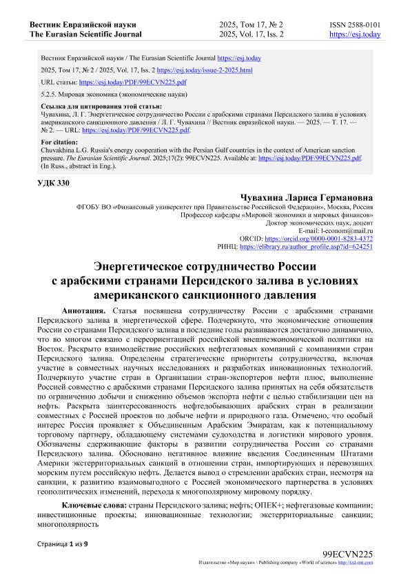 Чувахина, Л.Г. Энергетическое сотрудничество России с арабскими странами Персидского залива в условиях американского санкционного давления. — Текст: электронный // Вестник Евразийской науки. – 2025. – № 2. — URL: https://esj.today/PDF/99ECVN225.pdf (дата обращения: 21.10.2025) — <URL:http://elib.fa.ru/art2025/bv1608.pdf>.