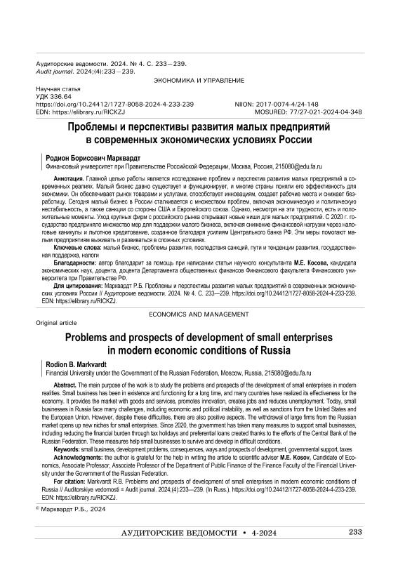 Марквардт, Р.Б. Проблемы и перспективы развития малых предприятий в современных экономических условиях России // Аудиторские ведомости. – 2024. – № 4. — С. 233-239. — Только в электронном виде. — <URL:http://elib.fa.ru/art2024/bv3301.pdf>.