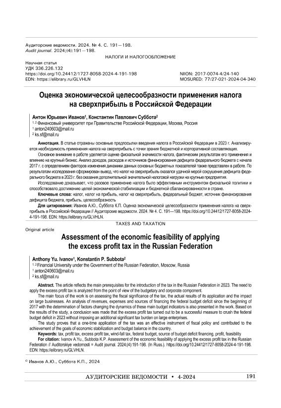 Иванов, А.Ю. Оценка экономической целесообразности применения налога на сверхприбыль в Российской Федерации / А.Ю. Иванов, К.П. Суббота // Аудиторские ведомости. – 2024. – № 4. — С. 191-198. — Только в электронном виде. — <URL:http://elib.fa.ru/art2024/bv3302.pdf>.