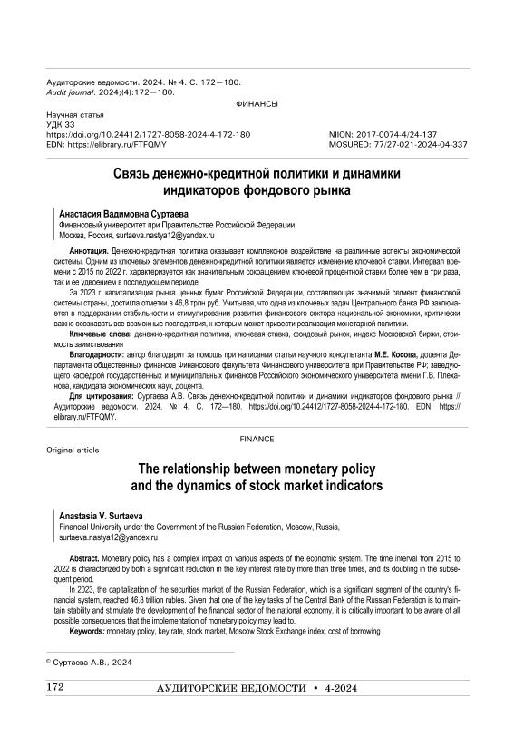 Суртаева, А.В. Связь денежно-кредитной политики и динамики индикаторов фондового рынка // Аудиторские ведомости. – 2024. – № 4. — С. 172-180. — Только в электронном виде. — <URL:http://elib.fa.ru/art2024/bv3303.pdf>.