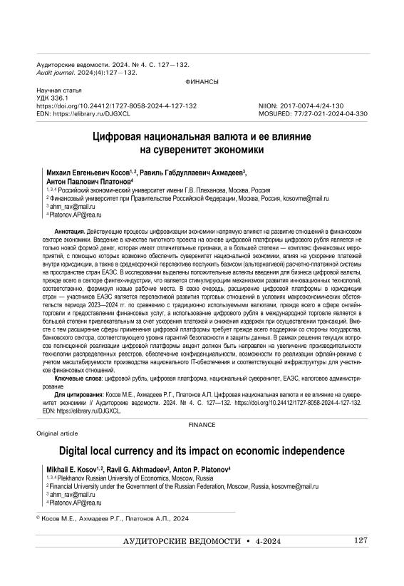 Косов, М.Е. Цифровая национальная валюта и ее влияние на суверенитет экономики / М.Е. Косов, Р.Г. Ахмадеев, А.П. Платонов // Аудиторские ведомости. – 2024. – № 4. — С. 127-132. — Только в электронном виде. — <URL:http://elib.fa.ru/art2024/bv3304.pdf>.