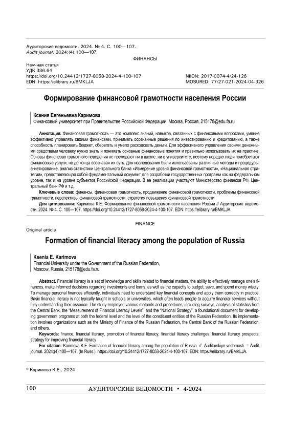 Каримова, К.Е. Формирование финансовой грамотности населения России // Аудиторские ведомости. – 2024. – № 4. — С. 100-107. — Только в электронном виде. — <URL:http://elib.fa.ru/art2024/bv3305.pdf>.