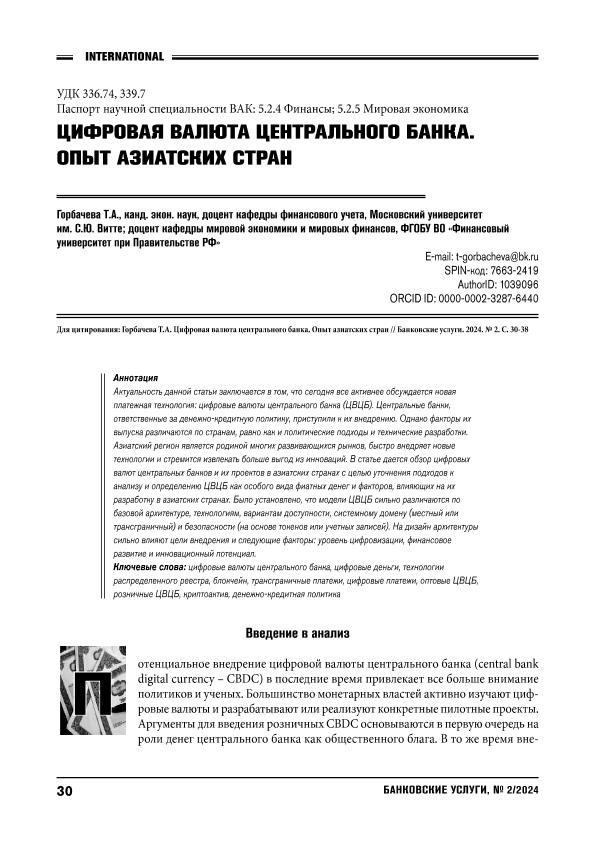 Горбачева, Т.А. Цифровая валюта центрального банка. Опыт азиатских стран // Банковские услуги. – 2024. – № 2. — С. 30-38. — Только в электронном виде. — <URL:http://elib.fa.ru/art2024/bv3306.pdf>.