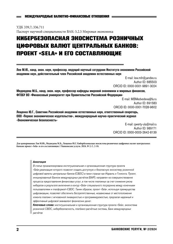 Лев, М.Ю. Кибербезопасная экосистема розничных цифровых валют центральных банков: проект «Sela» и его составляющие / М.Ю. Лев, М.Б. Медведева, Ю.Г. Лещенко // Банковские услуги. – 2024. – № 2. — С. 2-10. — Только в электронном виде. — <URL:http://elib.fa.ru/art2024/bv3307.pdf>.