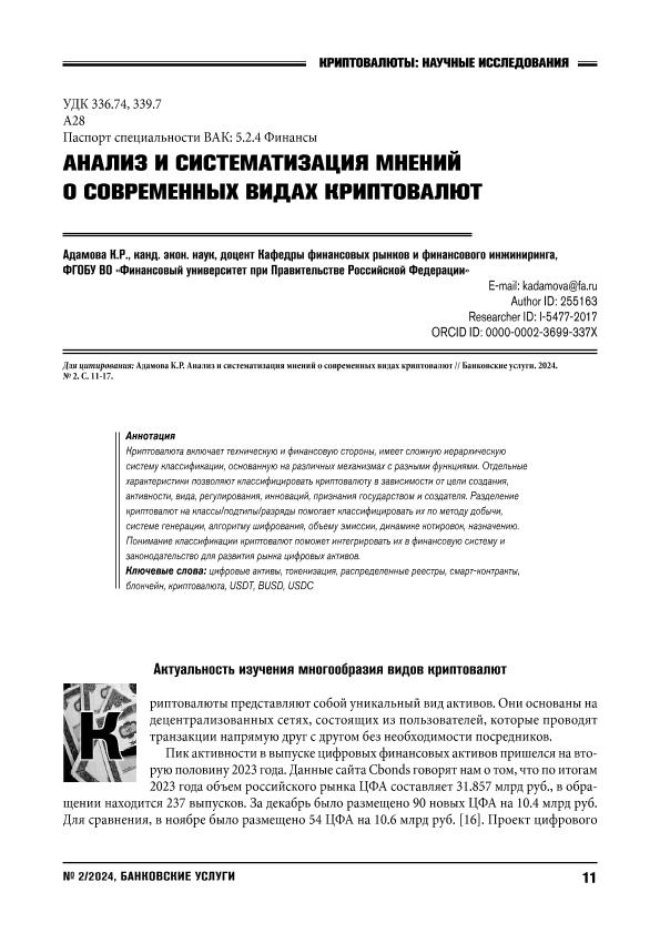 Адамова, К.Р. Анализ и систематизация мнений о современных видах криптовалют // Банковские услуги. – 2024. – № 2. — С. 11-17. — Только в электронном виде. — <URL:http://elib.fa.ru/art2024/bv3308.pdf>.