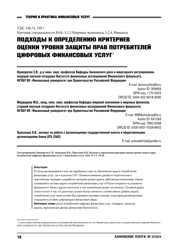 Криворучко, С.В. Подходы к определению критериев оценки уровня защиты прав потребителей цифровых финансовых услуг / С.В. Криворучко, М.Б. Медведева, Н.И. Прасолова // Банковские услуги. – 2024. – № 3. — С. 18-26. — Только в электронном виде. — <URL:http://elib.fa.ru/art2024/bv3309.pdf>.