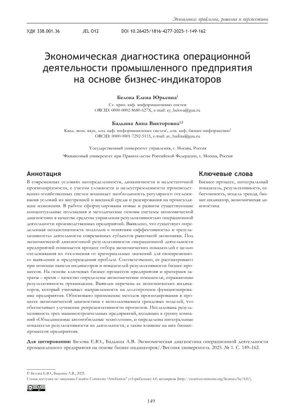 Белова, Е.Ю. Экономическая диагностика операционной деятельности промышленного предприятия на основе бизнес-индикаторов / Е.Ю. Белова, А.В. Бадьина // Вестник университета. – 2025. – № 1. — С. 149-162. — Только в электронном виде. — <URL:http://elib.fa.ru/art2025/bv1408.pdf>.