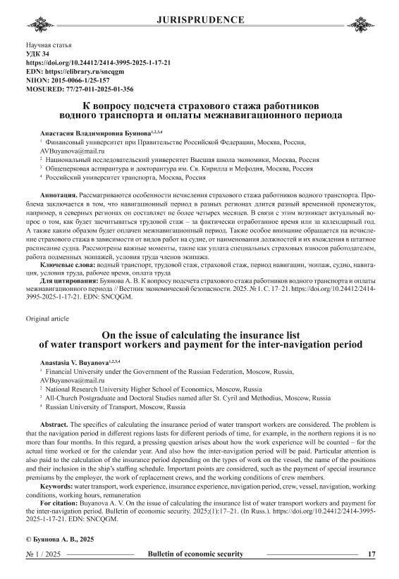 Буянова, А.В. К вопросу подсчета страхового стажа работников водного транспорта и оплаты межнавигационного периода // Вестник экономической безопасности. – 2025. – № 1. — С. 17-21. — Только в электронном виде. — <URL:http://elib.fa.ru/art2025/bv1409.pdf>.
