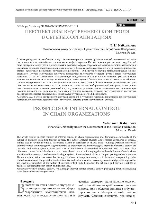 Кабалинова, В.И. Перспективы внутреннего контроля в сетевых организациях // Вестник Российского экономического университета имени Г.В. Плеханова. – 2025. – № 1. — С. 111-119. — Только в электронном виде. — <URL:http://elib.fa.ru/art2025/bv615.pdf>.
