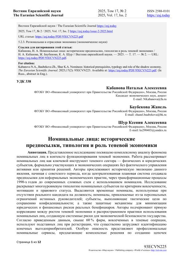 Кабанова, Н.А. Номинальные лица: исторические предпосылки, типология и роль теневой экономики / Н.А. Кабанова, Ж. Баубекова, К.А. Шур. — Текст: электронный // Вестник Евразийской науки. – 2025. – № 2. — URL: https://esj.today/PDF/93ECVN225.pdf (дата обращения: 20.10.2025) — <URL:http://elib.fa.ru/art2025/bv616.pdf>.