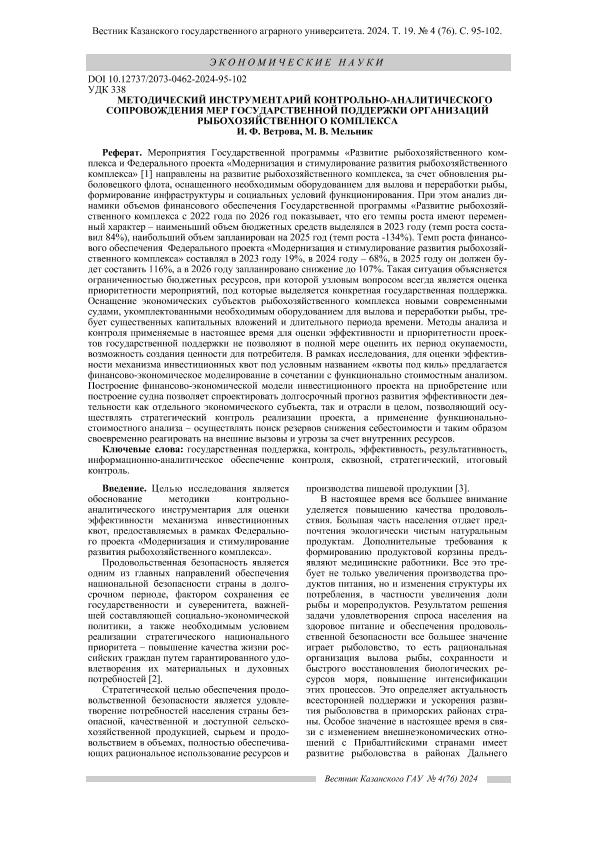 Ветрова, И.Ф. Методический инструментарий контрольно-аналитического сопровождения мер государственной поддержки организаций рыбохозяйственного комплекса / И.Ф. Ветрова, М.В. Мельник // Вестник Казанского государственного аграрного университета. – 2024. – № 4. — С. 95-102. — Только в электронном виде. — <URL:http://elib.fa.ru/art2024/bv3474.pdf>.