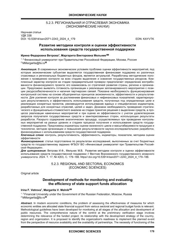 Ветрова, И.Ф. Развитие методики контроля и оценки эффективности использования средств государственной поддержки // Вестник Воронежского государственного аграрного университета. – 2024. – № 4. — С. 179-188. — Только в электронном виде. — <URL:http://elib.fa.ru/art2024/bv3475.pdf>.