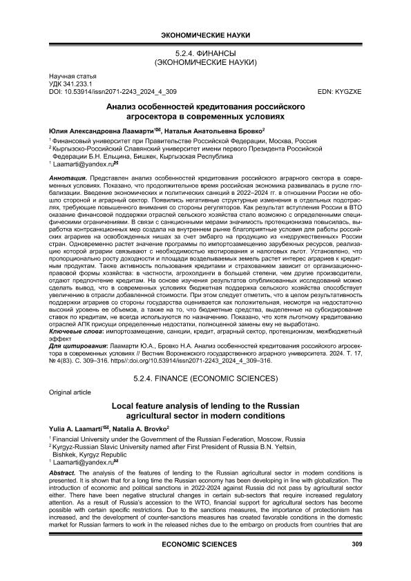 Лаамарти, Ю.А. Анализ особенностей кредитования российского агросектора в современных условиях / Ю.А. Лаамарти, Н.А. Бровко // Вестник Воронежского государственного аграрного университета. – 2024. – № 4. — С. 309-316. — Только в электронном виде. — <URL:http://elib.fa.ru/art2024/bv3490.pdf>.