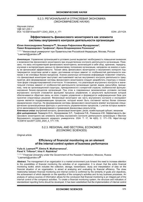 Эффективность финансового мониторинга как элемента системы внутреннего контроля деятельности организации / Ю.А. Лаамарти, Э.Р. Мухаррамова, П.В. Трифонов, И.В. Разинкина // Вестник Воронежского государственного аграрного университета. – 2024. – № 4. — С. 171-178. — Только в электронном виде. — <URL:http://elib.fa.ru/art2024/bv3491.pdf>.