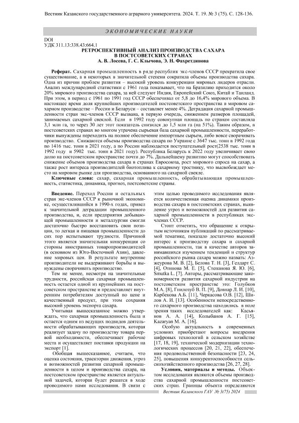 Лосева, А.В. Ретроспективный анализ производства сахара в постсоветских странах / А.В. Лосева, Г.С. Клычова, Э.Н. Фахретдинова // Вестник Казанского государственного аграрного университета. – 2024. – № 3. — С. 128-136. — Только в электронном виде. — <URL:http://elib.fa.ru/art2024/bv3494.pdf>.