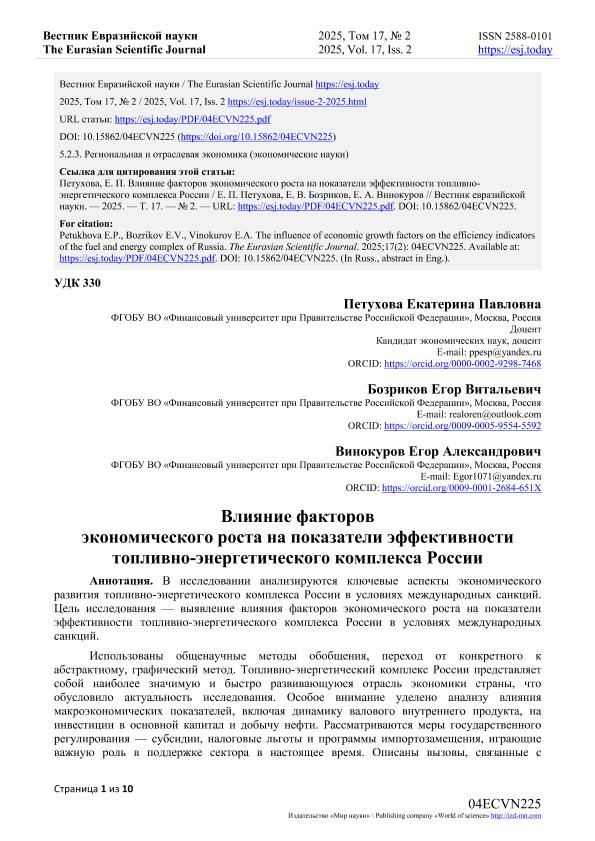 Петухова, Е.П. Влияние факторов экономического роста на показатели эффективности топливно-энергетического комплекса России / Е.П. Петухова, Е.В. Бозриков, Е.А. Винокуров. — Текст: электронный // Вестник Евразийской науки. – 2025. – № 2. — URL: https://esj.today/PDF/04ECVN225.pdf (дата обращения: 20.10.2025) — <URL:http://elib.fa.ru/art2025/bv1523.pdf>.