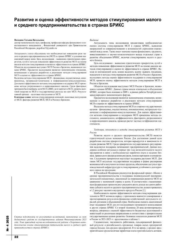 Погодина, Т.В. Развитие и оценка эффективности методов стимулирования малого и среднего предпринимательства в странах БРИКС // Экономика строительства. – 2025. – № 4. — С. 22-26. — Только в электронном виде. — <URL:http://elib.fa.ru/art2025/bv1530.pdf>.