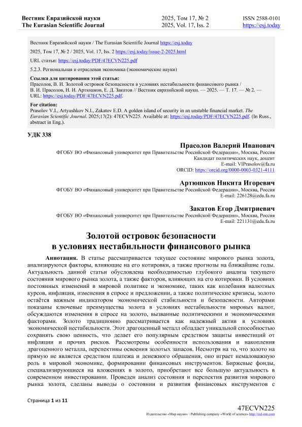 Прасолов, В.И. Золотой островок безопасности в условиях нестабильности финансового рынка / В.И. Прасолов, Н.И. Артюшков, Е.Д. Закатов. — Текст: электронный // Вестник Евразийской науки. – 2025. – № 2. — URL: https://esj.today/PDF/47ECVN225.pdf (дата обращения: 20.10.2025) — <URL:http://elib.fa.ru/art2025/bv1542.pdf>.