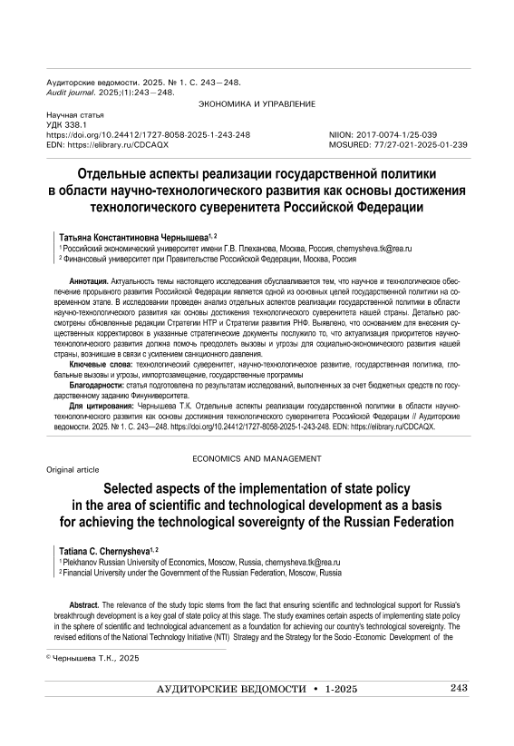 Чернышева, Т.К. Отдельные аспекты реализации государственной политики в области научно-технологического развития как основы достижения технологического суверенитета Российской Федерации // Аудиторские ведомости. – 2025. – № 1. — С. 243-248. — Только в электронном виде. — <URL:http://elib.fa.ru/art2025/bv1602.pdf>.