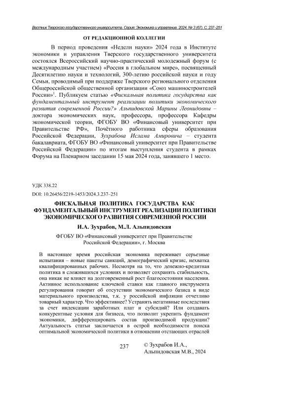 Зухрабов, И.А. Фискальная политика государства как фундаментальный инструмент реализации политики экономического развития современной России / И.А. Зухрабов, М.Л. Альпидовская // Вестник Тверского государственного университета. Серия: Экономика и управление. – 2024. – № 3. — С. 237-251. — Только в электронном виде. — <URL:http://elib.fa.ru/art2024/bv3357.pdf>.