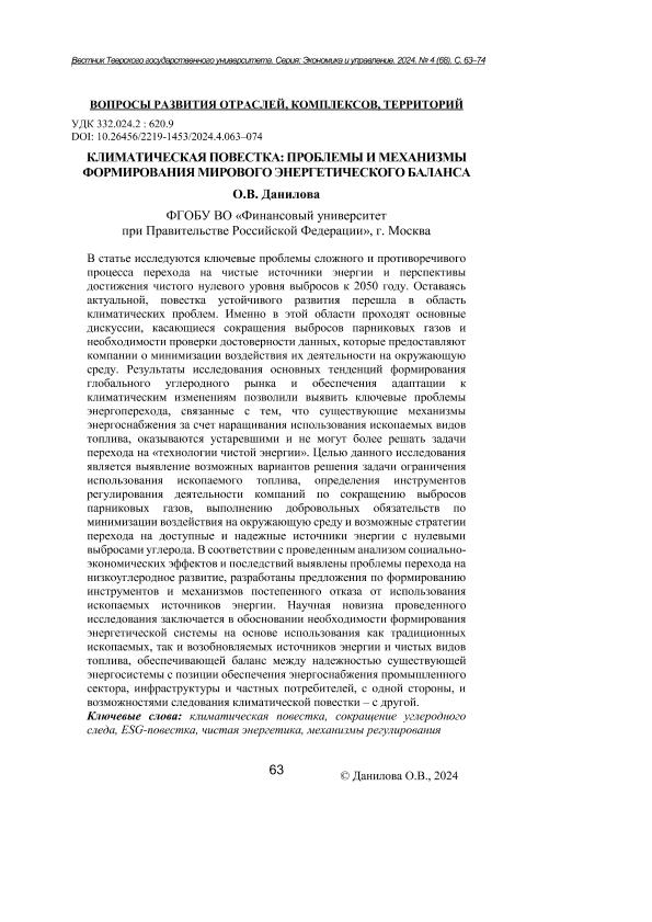 Данилова, О.В. Климатическая повестка: проблемы и механизмы формирования мирового энергетического баланса // Вестник Тверского государственного университета. Серия: Экономика и управление. – 2024. – № 4. — С. 63-74. — Только в электронном виде. — <URL:http://elib.fa.ru/art2024/bv3358.pdf>.