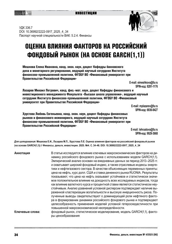Мешкова, Е.И. Оценка влияния факторов на российский фондовый рынок (на основе GARCH(1,1)) / Е.И. Мешкова, М.П. Лазарев, Л.Е. Хрустова // Финансы, деньги, инвестиции. – 2025. – № 4. — С. 34-46 — <URL:http://elib.fa.ru/art2025/bv1481.pdf>.