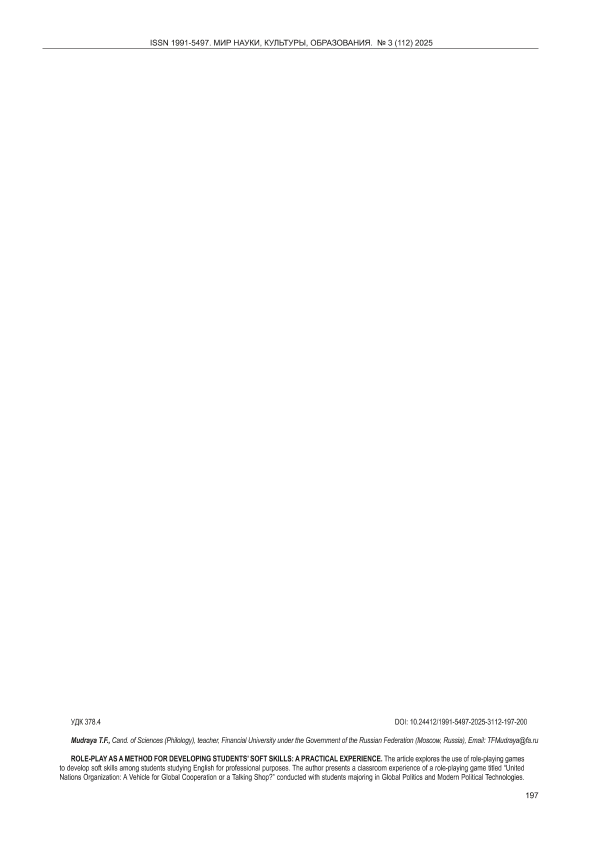 Мудрая, Т.Ф. Ролевая игра как способ развития «мягких навыков» у студентов: об опыте применения // Мир науки, культуры, образования. – 2025. – № 3. — С. 197-200. — Только в электронном виде. — <URL:http://elib.fa.ru/art2025/bv1482.pdf>.