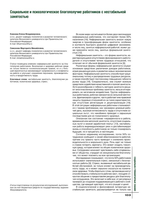 Камнева, Е.В. Социальное и психологическое благополучие работников с нестабильной занятостью / Е.В. Камнева, М.М. Симонова // Социально-гуманитарные знания. – 2025. – № 3. — С. 103-106. — Только в электронном виде. — <URL:http://elib.fa.ru/art2025/bv2544.pdf>.