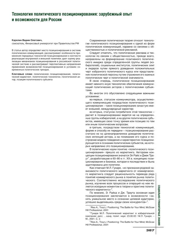 Карелин, В.О. Технология политического позиционирования: зарубежный опыт и возможности для России // Социально-гуманитарные знания. – 2025. – № 3. — С. 387-390. — Только в электронном виде. — <URL:http://elib.fa.ru/art2025/bv2547.pdf>.