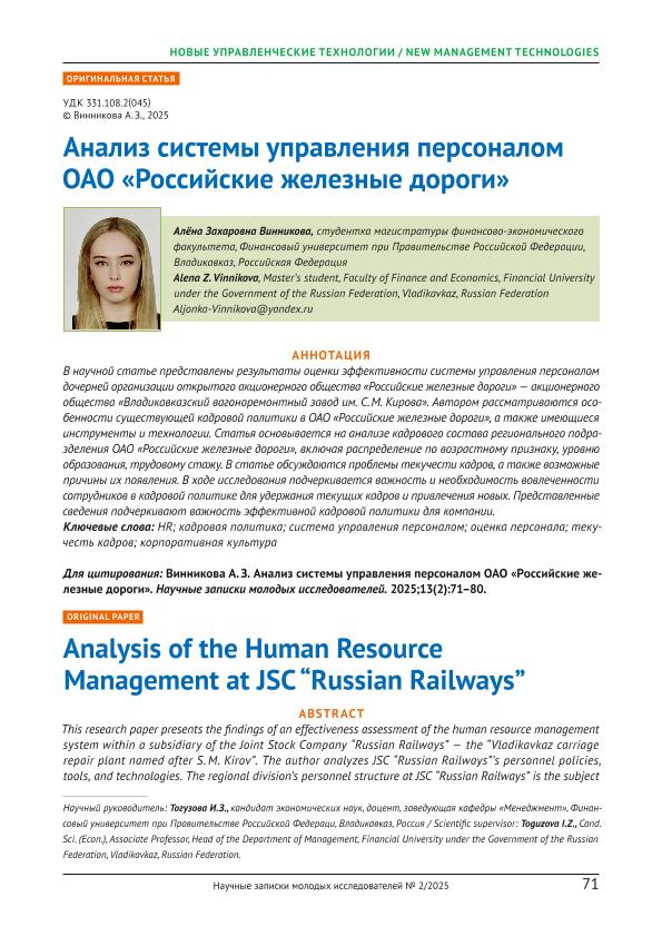 Винникова, А.З. Анализ системы управления персоналом ОАО «Российские железные дороги» // Научные записки молодых исследователей. – 2025. – № 2. — С. 71-80 — <URL:http://elib.fa.ru/art2025/bv426.pdf>.