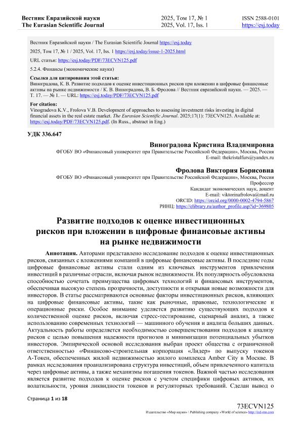 Виноградова, К.В. Развитие подходов к оценке инвестиционных рисков при вложении в цифровые финансовые активы на рынке недвижимости / К.В. Виноградова, В.Б. Фролова. — Текст: электронный // Вестник Евразийской науки. – 2025. – № 1. — URL: https://esj.today/PDF/73ECVN125.pdf (дата обращения: 14.10.2025) — <URL:http://elib.fa.ru/art2025/bv427.pdf>.