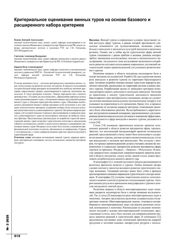 Власов, Д.А. Критериальное оценивание винных туров на основе базового и расширенного набора критериев / Д.А. Власов, А.В. Синчуков, П.А. Карасев // Экономика строительства. – 2025. – № 3. — С. 512-516. — Только в электронном виде. — <URL:http://elib.fa.ru/art2025/bv428.pdf>.