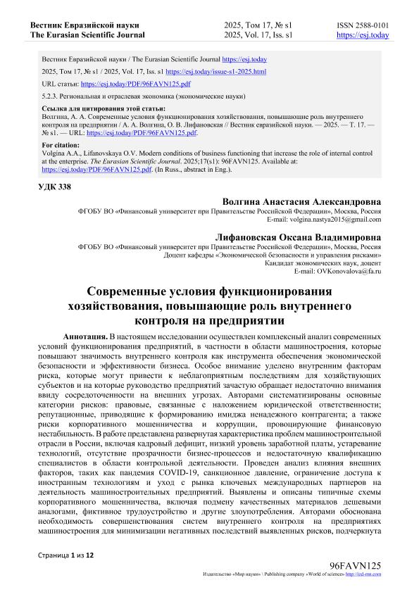 Волгина, А.А. Современные условия функционирования хозяйствования, повышающие роль внутреннего контроля на предприятии / А.А. Волгина, О.В. Лифановская. — Текст: электронный // Вестник Евразийской науки. – 2025. – № s1. — URL: https://esj.today/PDF/96FAVN125.pdf (дата обращения: 17.09.2025) — <URL:http://elib.fa.ru/art2025/bv429.pdf>.
