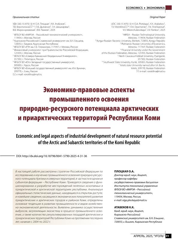 Экономико-правовые аспекты промышленного освоения природно-ресурсного потенциала арктических и приарктических территорий Республики Коми / О.А. Плоцкая, К.К. Атабеков, Т.В. Воротилина [и др.] // Уголь. – 2025. – № 4. — С. 31-36. — Только в электронном виде. — <URL:http://elib.fa.ru/art2025/bv430.pdf>.