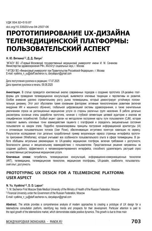 Вяткина, Н.Ю. Прототипирование UX-дизайна телемедицинской платформы: пользовательский аспект / Н.Ю. Вяткина, Д.Д. Лапун // Международная экономика. – 2025. – № 8. — С. 703-717 — <URL:http://elib.fa.ru/art2025/bv431.pdf>.