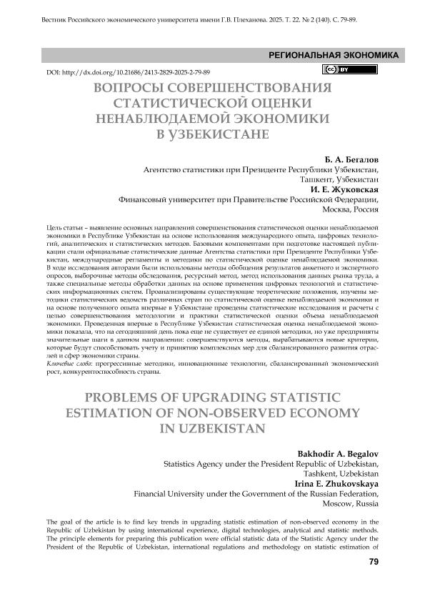 Бегалов, Б.А. Вопросы совершенствования статистической оценки ненаблюдаемой экономики в Узбекистане / Б.А. Бегалов, И.Е. Жуковская // Вестник Российского экономического университета имени Г.В. Плеханова. – 2025. – № 2. — С. 79-89. — Только в электронном виде. — <URL:http://elib.fa.ru/art2025/bv372.pdf>.