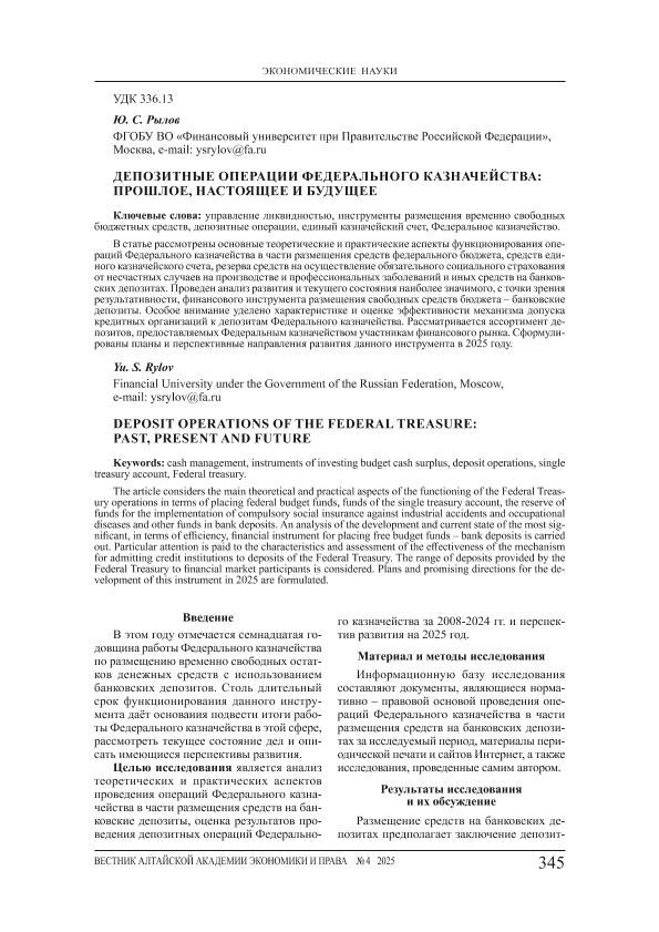 Рылов, Ю.С. Депозитные операции Федерального казначейства: прошлое, настоящее и будущее // Вестник Алтайской академии экономики и права. – 2025. – № 4-2. — С. 345-351. — Только в электронном виде. — <URL:http://elib.fa.ru/art2025/bv1548.pdf>.