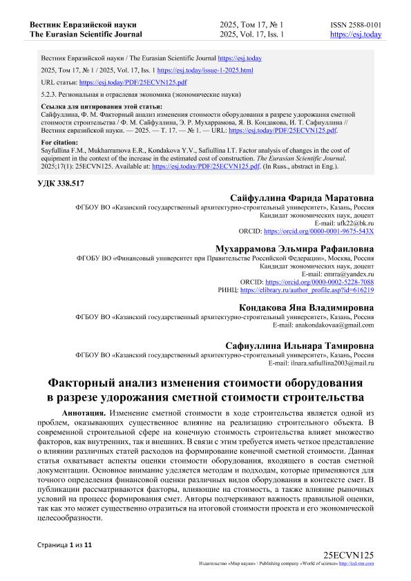 Факторный анализ изменения стоимости оборудования в разрезе удорожания сметной стоимости строительства / Ф.М. Сайфуллина, Э.Р. Мухаррамова, Я.В. Кондакова, И.Т. Сафиуллина. — Текст: электронный // Вестник Евразийской науки. – 2025. – № 1. — URL: https://esj.today/PDF/25ECVN125.pdf (дата обращения: 15.10.2025) — <URL:http://elib.fa.ru/art2025/bv1563.pdf>.
