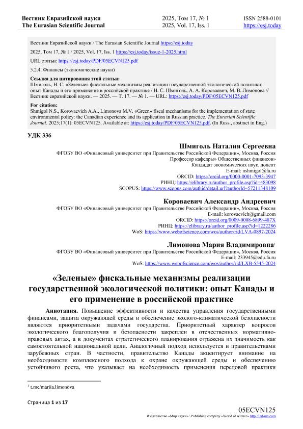 Шмиголь, Н.С. «Зеленые» фискальные механизмы реализации государственной экологической политики: опыт Канады и его применение в российской практике / Н.С. Шмиголь, А.А. Короваевич, М.В. Лимонова. — Текст: электронный // Вестник Евразийской науки. – 2025. – № 1. — URL: https://esj.today/PDF/05ECVN125.pdf (дата обращения: 15.10.2025) — <URL:http://elib.fa.ru/art2025/bv1632.pdf>.