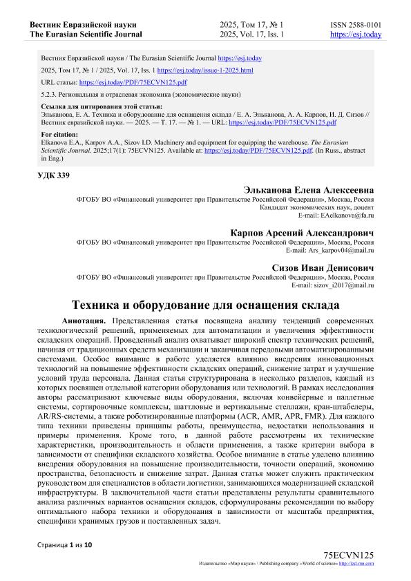 Эльканова, Е.А. Техника и оборудование для оснащения склада / Е.А. Эльканова, А.А. Карпов, И.Д. Сизов. — Текст: электронный // Вестник Евразийской науки. – 2025. – № 1. — URL: https://esj.today/PDF/75ECVN125.pdf (дата обращения: 15.10.2025) — <URL:http://elib.fa.ru/art2025/bv1638.pdf>.