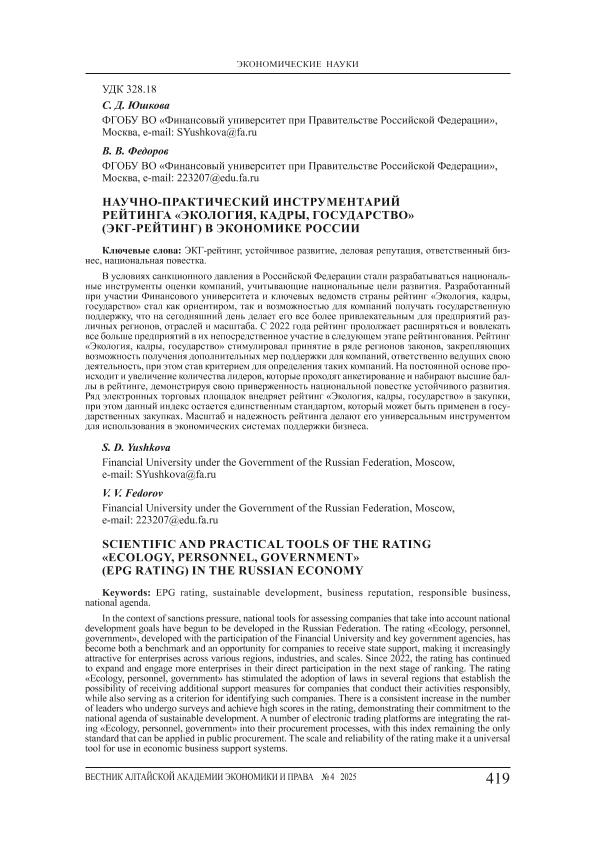 Юшкова, С.Д. Научно-практический инструментарий рейтинга «Экология, кадры, государство» (ЭКГ-рейтинг) в экономике России / С.Д. Юшкова, В.В. Федоров // Вестник Алтайской академии экономики и права. – 2025. – № 4-2. — С. 419-426. — Только в электронном виде. — <URL:http://elib.fa.ru/art2025/bv1643.pdf>.