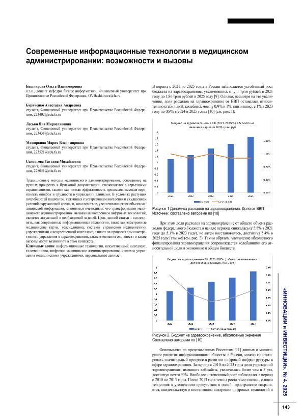 Современные информационные технологии в медицинском администрировании: возможности и вызовы / О.В. Башкирова, А.А. Буряченко, Я.М. Лесько [и др.] // Инновации и инвестиции. – 2025. – № 4. — С. 143-146. — Только в электронном виде. — <URL:http://elib.fa.ru/art2025/bv1282.pdf>.