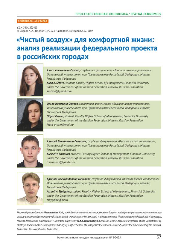 «Чистый воздух» для комфортной жизни: анализ реализации федерального проекта в российских городах / А.А. Сизова, О.И. Орлова, А.В. Сивопляс, А.А. Цейгалов // Научные записки молодых исследователей. – 2025. – № 3. — С. 37-44 — <URL:http://elib.fa.ru/art2025/bv1585.pdf>.