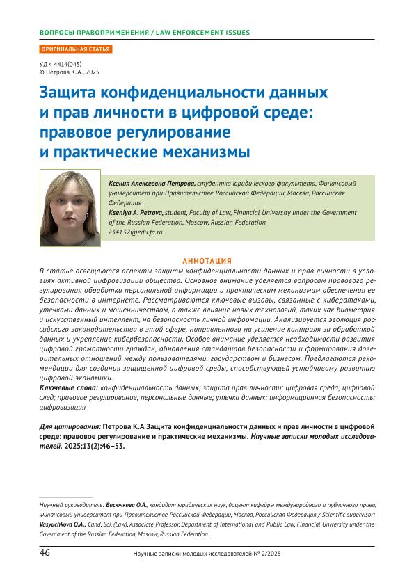 Петрова, К.А. Защита конфиденциальности данных и прав личности в цифровой среде: правовое регулирование и практические механизмы // Научные записки молодых исследователей. – 2025. – № 2. — С. 46-53 — <URL:http://elib.fa.ru/art2025/bv1522.pdf>.