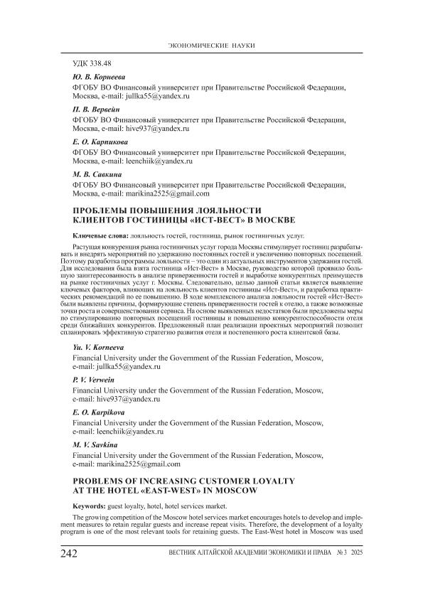 Проблемы повышения лояльности клиентов гостиницы «Ист-Вест» в Москве / Ю.В. Корнеева, П.В. Вервейн, Е.О. Карпикова, М.В. Савкина // Вестник Алтайской академии экономики и права. – 2025. – № 3-2. — С. 242-250. — Только в электронном виде. — <URL:http://elib.fa.ru/art2025/bv1546.pdf>.