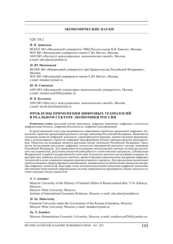 Проблемы применения цифровых технологий в реальном секторе экономики России / Н.В. Артемьев, М.Ю. Маковецкий, Ю.Н. Сотников, Н.В. Кузьмина // Вестник Алтайской академии экономики и права. – 2025. – № 3-2. — С. 195-203. — Только в электронном виде. — <URL:http://elib.fa.ru/art2025/bv1547.pdf>.