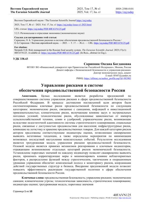 Скрипник, О.Б. Управление рисками в системе обеспечения продовольственной безопасности России. — Текст: электронный // Вестник Евразийской науки. – 2025. – № s1. — URL: https://esj.today/PDF/40FAVN125.pdf (дата обращения: 09.10.2025) — <URL:http://elib.fa.ru/art2025/bv1593.pdf>.