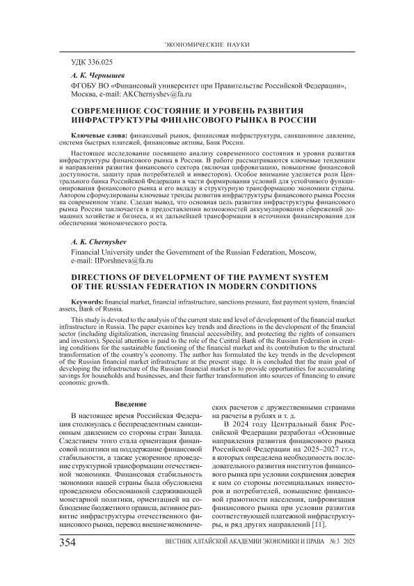 Чернышев, А.К. Современное состояние и уровень развития инфраструктуры финансового рынка в России // Вестник Алтайской академии экономики и права. – 2025. – № 3-2. — С. 354-360. — Только в электронном виде. — <URL:http://elib.fa.ru/art2025/bv1599.pdf>.